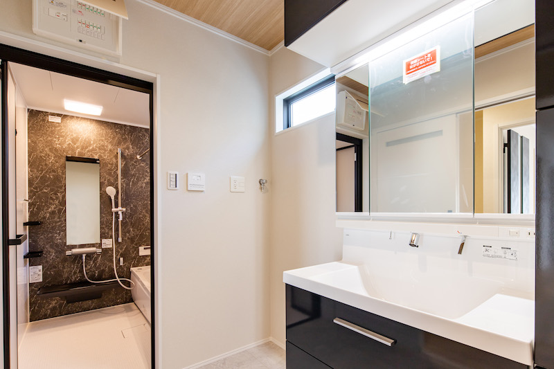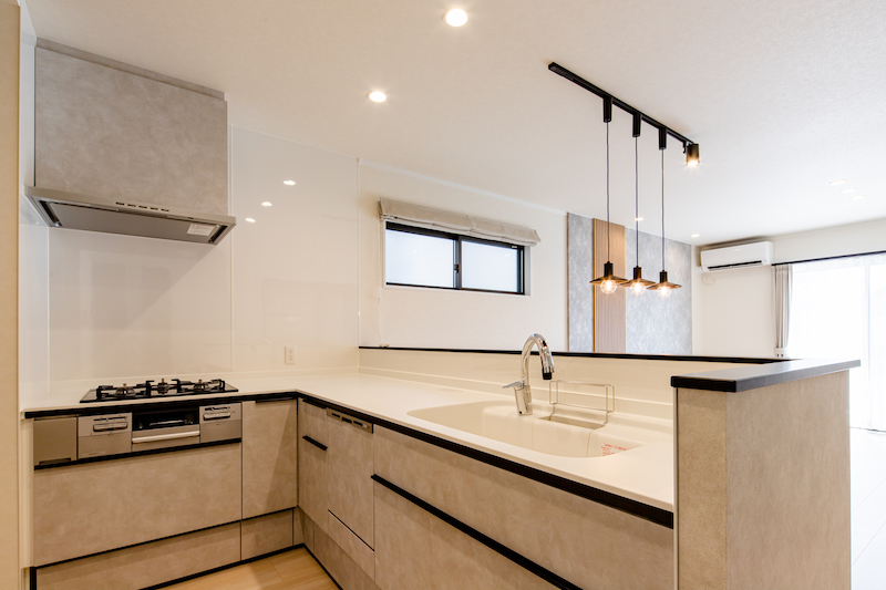 2号棟は家族で楽しくお料理ができるL型キッチンを採用した住まい。作業スペースが広く取りやすく動きやすいキッチン。パントリーもワイドタイプでお菓子の材料なども難なく収納。