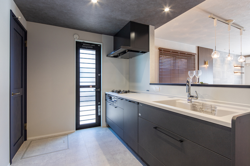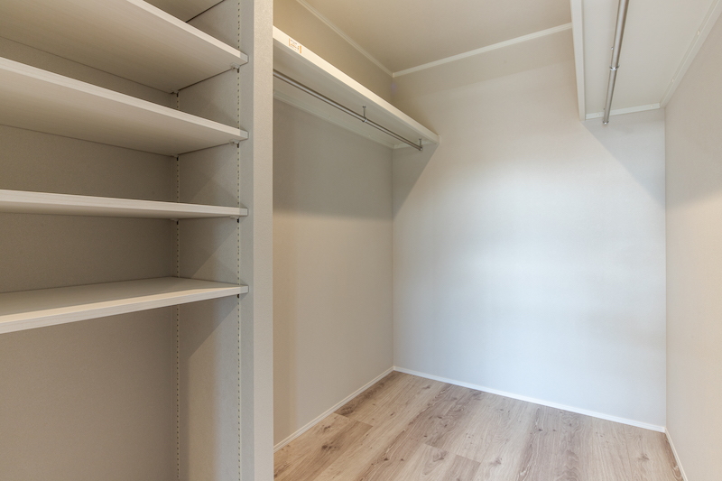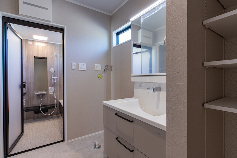 5号棟は大きめのウォークインパントリーのある住まい。細々とした物の片づけに便利でキッチン周りをスッキリ保てます。洗面脱衣室は3帖タイプで収納棚も設置してあるのでタオルなどの収納に使えます。