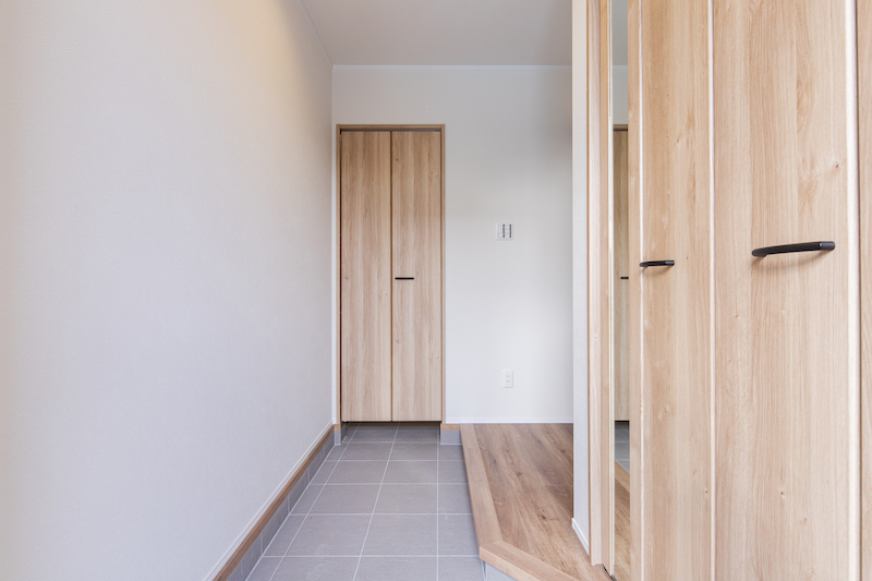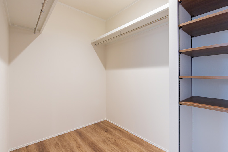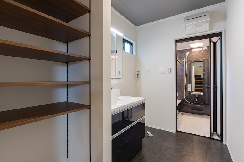2号棟は広さがポイントのL型キッチンを採用。作業スペースが広く家族で料理を楽しめます。洗面脱衣室は3帖タイプでリネン収納棚付き。タオルやシャンプーのストックはこちらに収納。