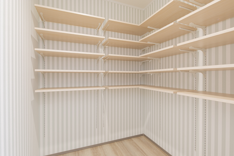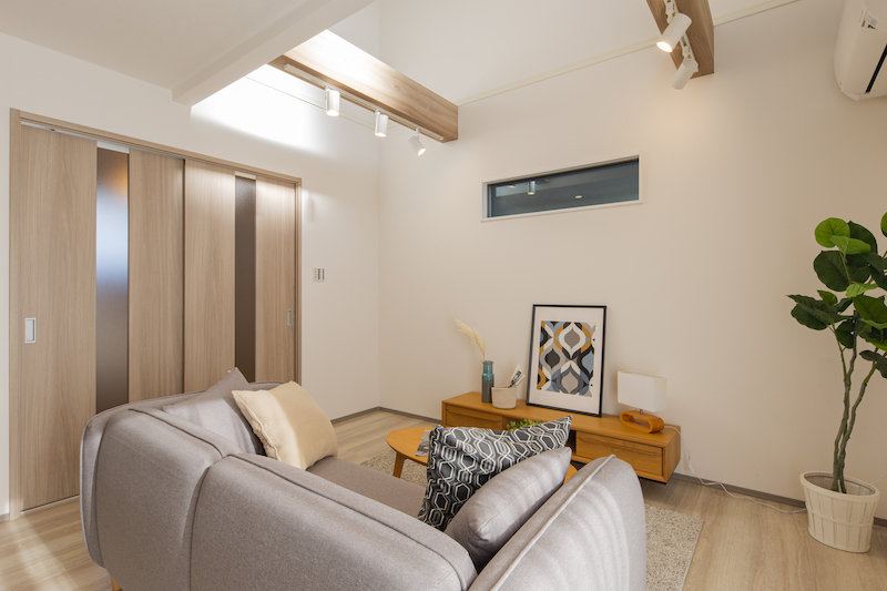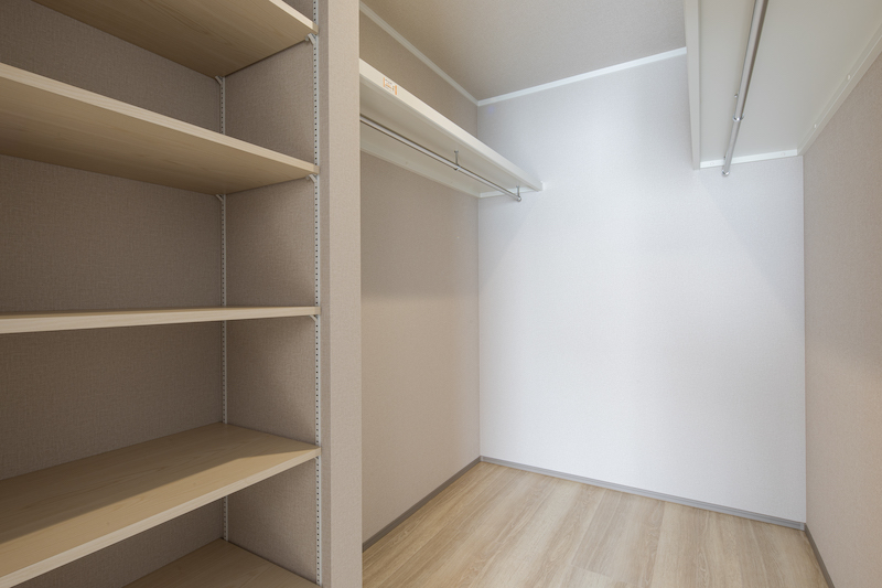 1号棟は随所に収納を配置した居住空間を有効的に使える間取り。土間収納、納戸、パントリー、リネン収納、ウォークインCLと必要な場所に必要な収納が配置された暮らしやすい住まい。自然光を採り入れるリビング吹抜けあり。