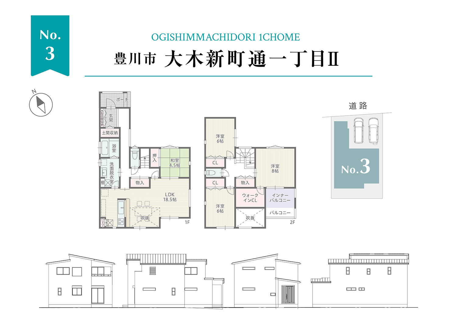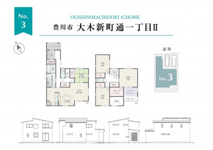 3号棟は玄関ポーチに目隠しになる縦格子の付いたおしゃれな外観が特徴的な住まい。水廻りが集約されており家事動線も考慮!急な天候の変化にも安心なインナーバルコニーも装備。
