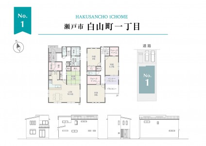 1号棟は玄関からキッチンへ抜けられるウォークスルー収納のある住まい。買い物帰りに収納しながらキッチンへ行ける便利で人気のある動線。キッチンは作業スペースが広く取れるL型を採用。2階は6帖以上の洋室を配置。