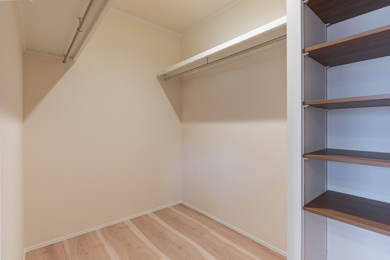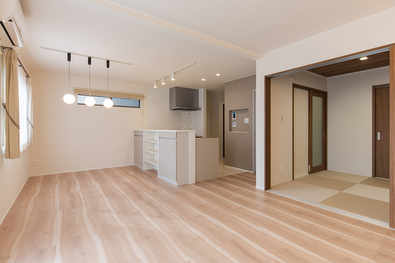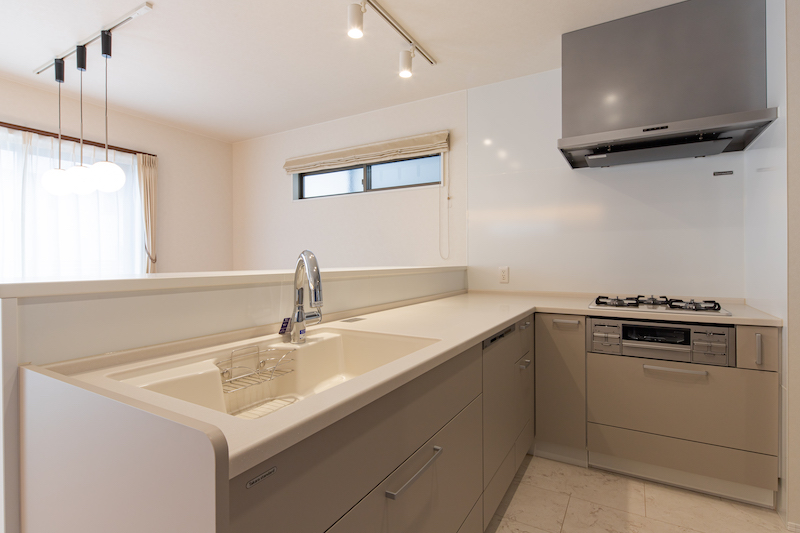 3号棟は玄関からキッチンへ抜けられるウォークスルー収納のある住まい。買い物帰りに収納しながらキッチンへ行ける便利で人気のある動線。キッチンは作業スペースが広く取れるL型を採用しご家族で楽しくお料理も。