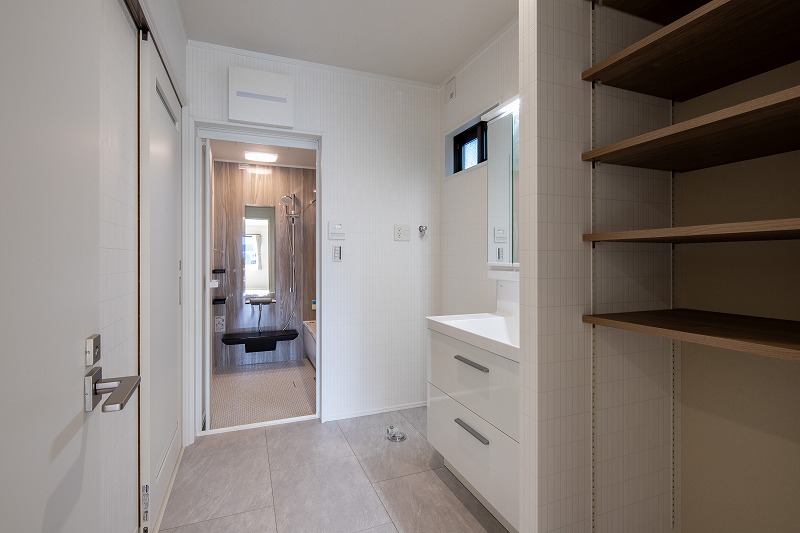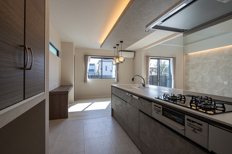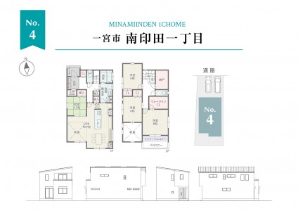 4号棟は「ながら家事」もしやすい水廻りが直線的な動線がポイント!動線周りに収納もあるので便利。ダイニングの壁付カウンターはちょっとしたデスクワークにピッタリ。2階には多用途な3帖納戸を配置。