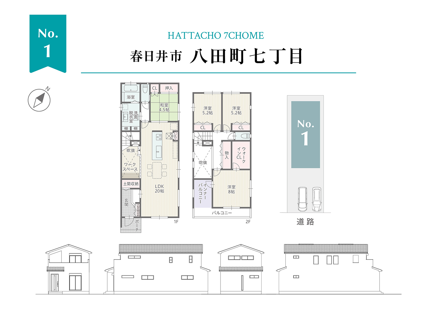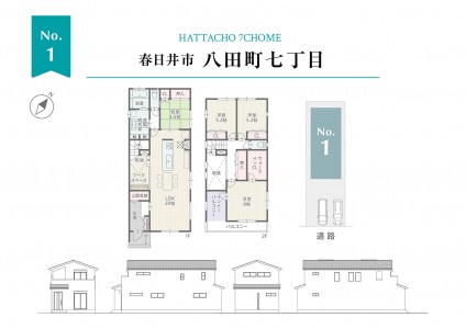 1号棟は4LDK+ワークスペースのある住まい。家の中心にあるスペースは家族のコミュニケーションが取りやすく、同じ空間で過ごしながらも自分の時間が持てる住まい。2階のワイド廊下収納は便利。