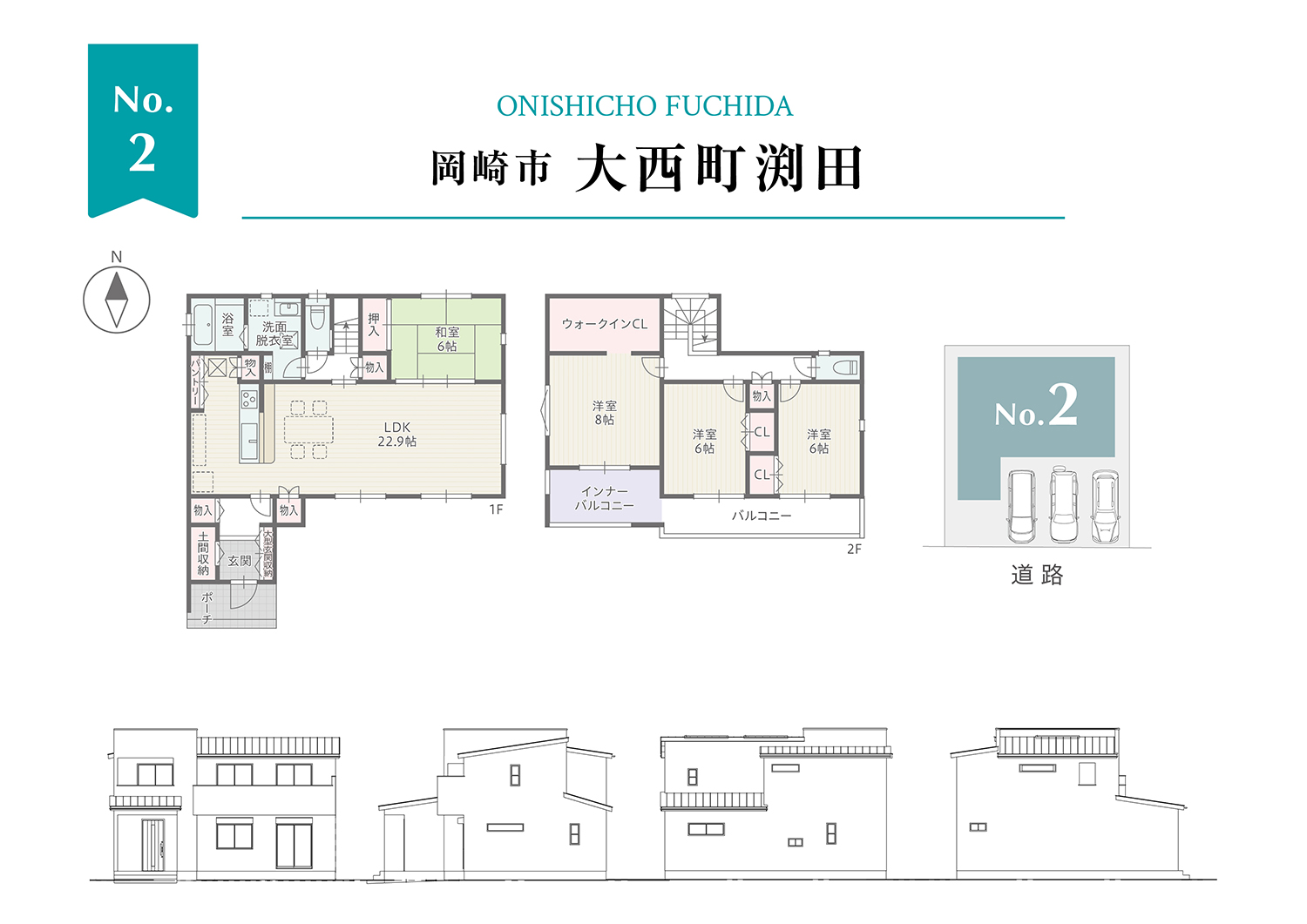 2号棟は南面に広がる22帖のLDKがある住まい。どの部屋にいても自然光が差し込みます。すべての居室は6帖以上で収納付きなので居室をスッキリと保てます。主寝室は8帖で4帖のウォークインクローゼット付き。