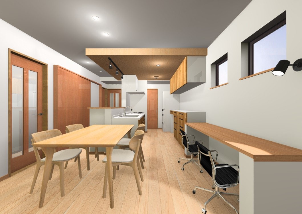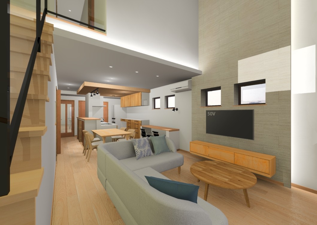 2.吹抜けとリビング階段を利用して効果的に間接照明を配置しています。壁や天井に反射した柔らかい光がLDK全体を包み込み、リラックスとした空間を演出しました。
