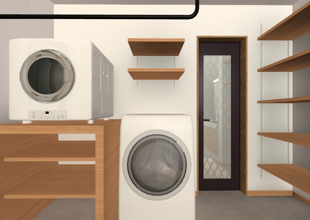 4.洗濯機を回してそのままウッドデッキの付いた物干し場へすぐに出られる洗面脱衣室。その隣にはファミリークローゼットが併設していて家事動線抜群の間取りです。